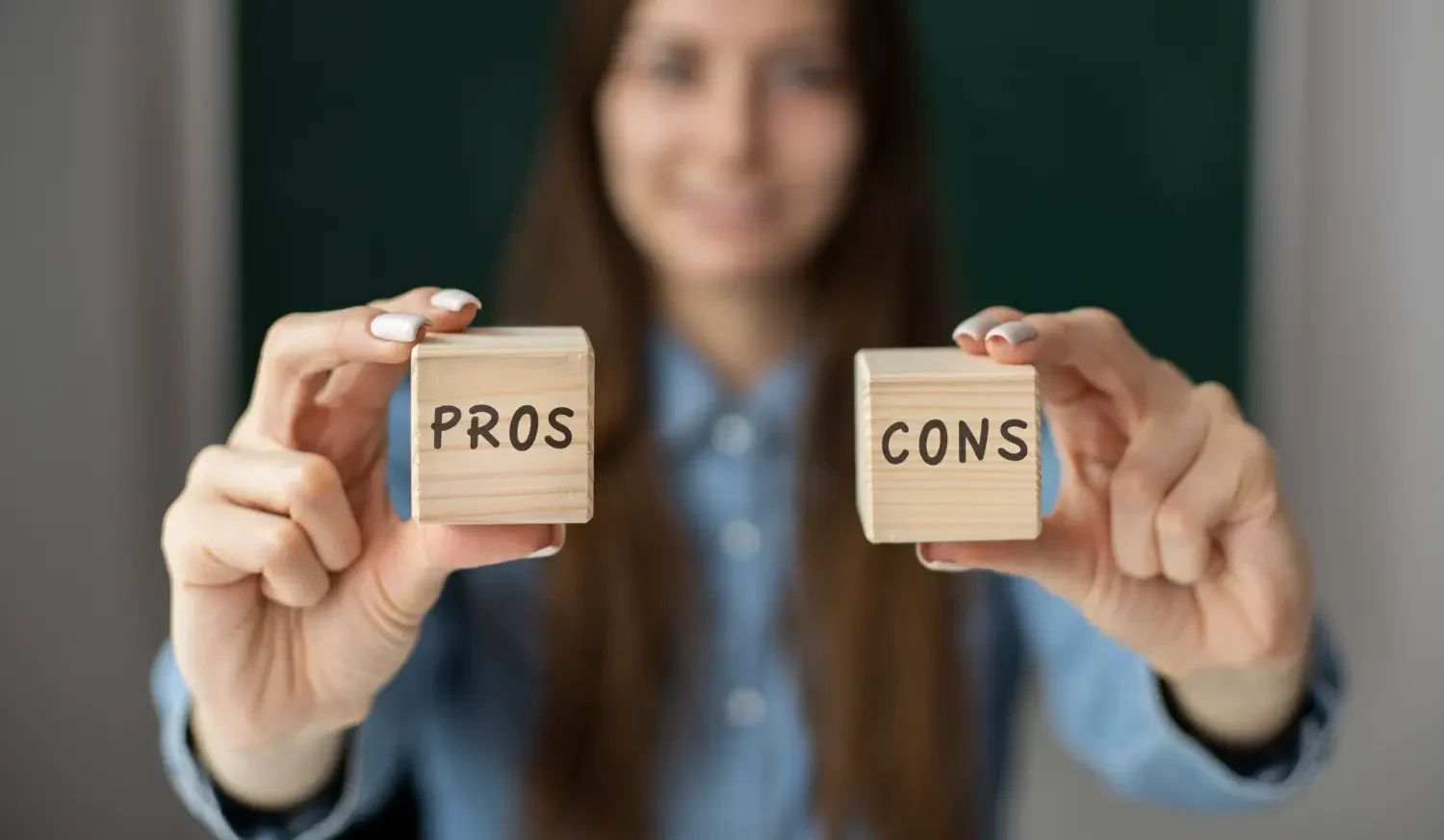 A woman holding "PROS" and "CONS" blocks, representing Contemplation stage ambivalence.